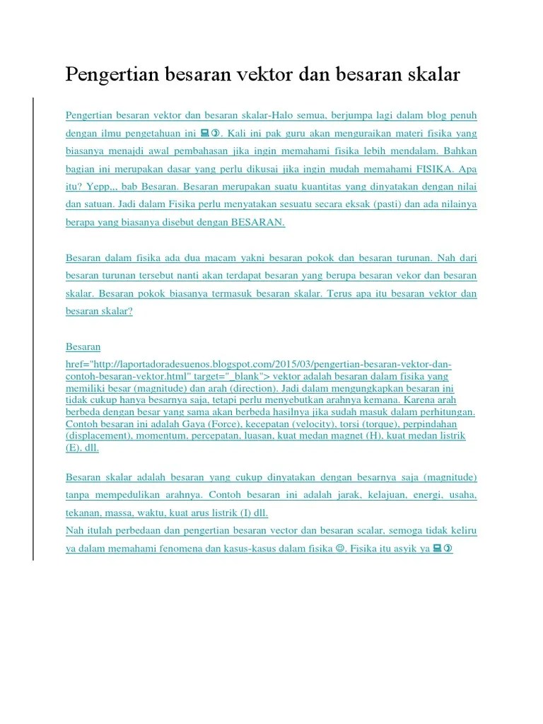 Mengenai apa itu fisika dan hakikatnya, metode ilmiah dan keselamatan kerja dalam melakukan. Apakah yang dimaksud dengan besaran vektor? Sedangkan skalar tidak memiliki arah. Beberapa besaran fisika yang termasuk besaran vektor adalah kecepatan, percepatan, gaya, dan momentum, dll. Besaran yang memiliki besar (modulus) dan arah.