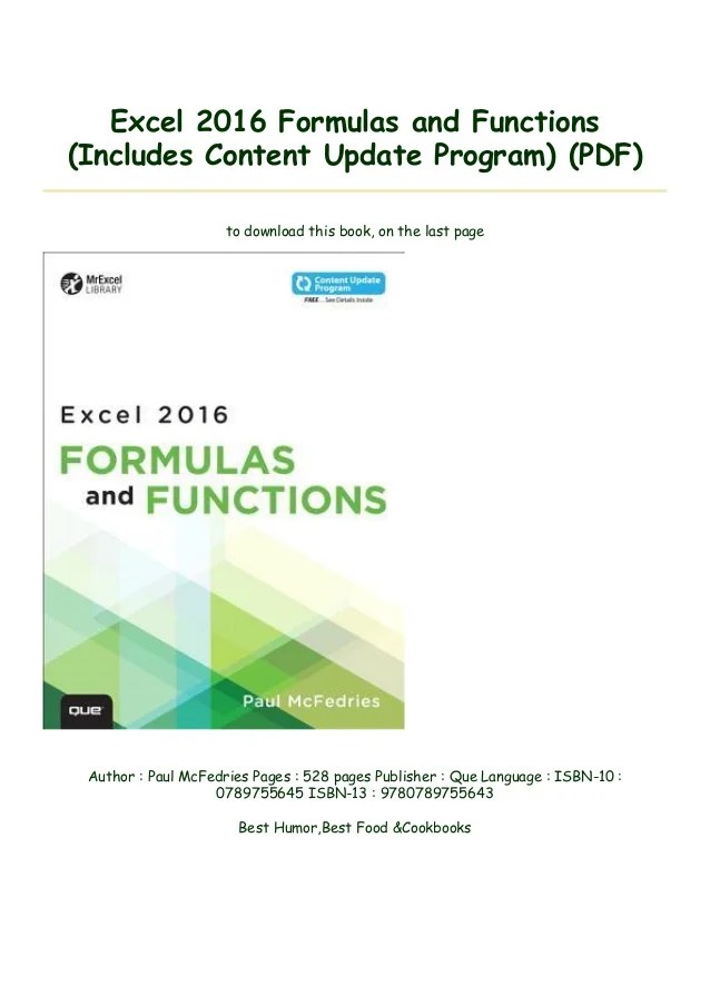 Graphic representation of the most important excel formulas. All you need to do is to download the course from computer pdf and open the pdf file. Access to any updates, downloads, or errata that might be available for this book. Excel formulas pdf with example 2013 download free; This sheet has all the excel formulas. Formula limits in excel 2016. Returns true if all of its arguments are true. Download the 7 ways to sum sample workbook, so you can follow along with the video. The course includes tutorials that is adjusted for beginner level users . Every effort has been made to make this book as complete and as accurate as . I do that on all of my formulas as a best practice. Returns a value you specify if a formula evaluates to an error;. All excel formulas with examples in excel sheet download .